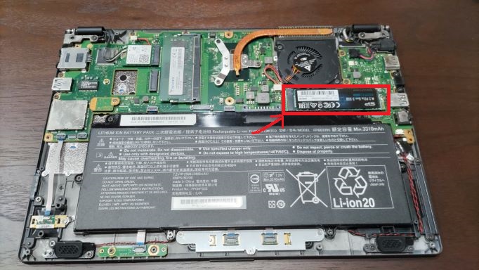 赤枠で囲った部分にSSD(SATA)が装着されていますので、これを新しく購入したSSD(NVMe)に差し換えます。