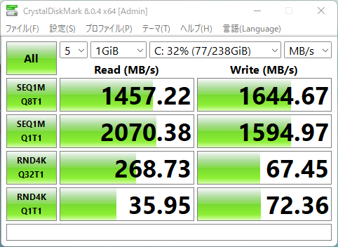 換装後、Crystal Disk Markで速度をチェックしてみました。