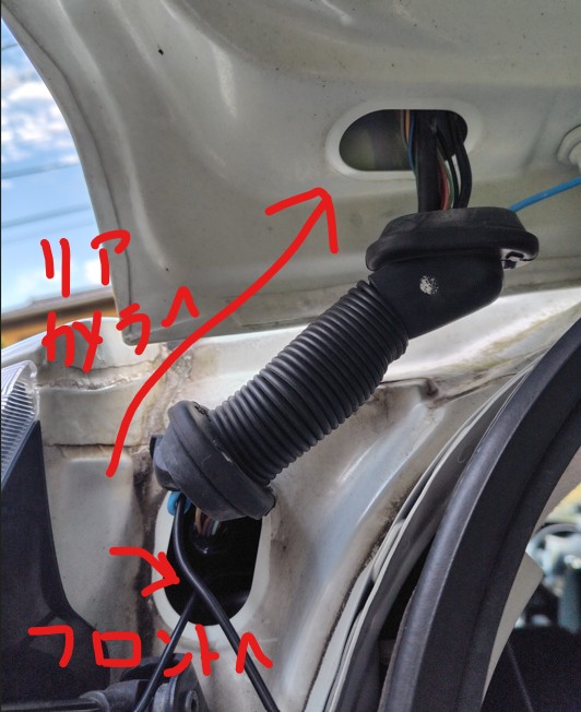 蛇腹はボディとの接続部を丁寧にはがしてやれば簡単に外すことができます。ダイハツ車のようにカプラーもないので、コードを通すのも簡単です。私はクリーニングでもらえる針金ハンガーをガイドにして配線をしました。硬さが使いやすいです。