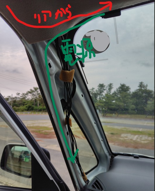 フロントカメラから電源コードをダッシュボードに引き込みます。